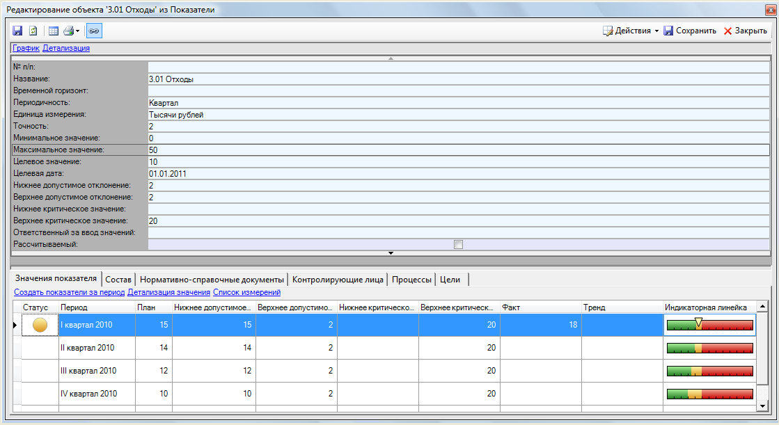 На примере статьи «3.01 Отходы» рассмотрим понятия «Целевое значение», «Периодичность контроля статьи», «Плановые значения». По этой статье к концу года мы стремимся к уровню затрат в 10 тысяч рублей в квартал. Это наше целевое значение. Сегодня уровень наших затрат по этой статье значительно больше. Поэтому, мы будем планировать наше поступательно движение к «Целевому значению» при помощи «Плановых значений» на каждый квартал («Периодичность») года.