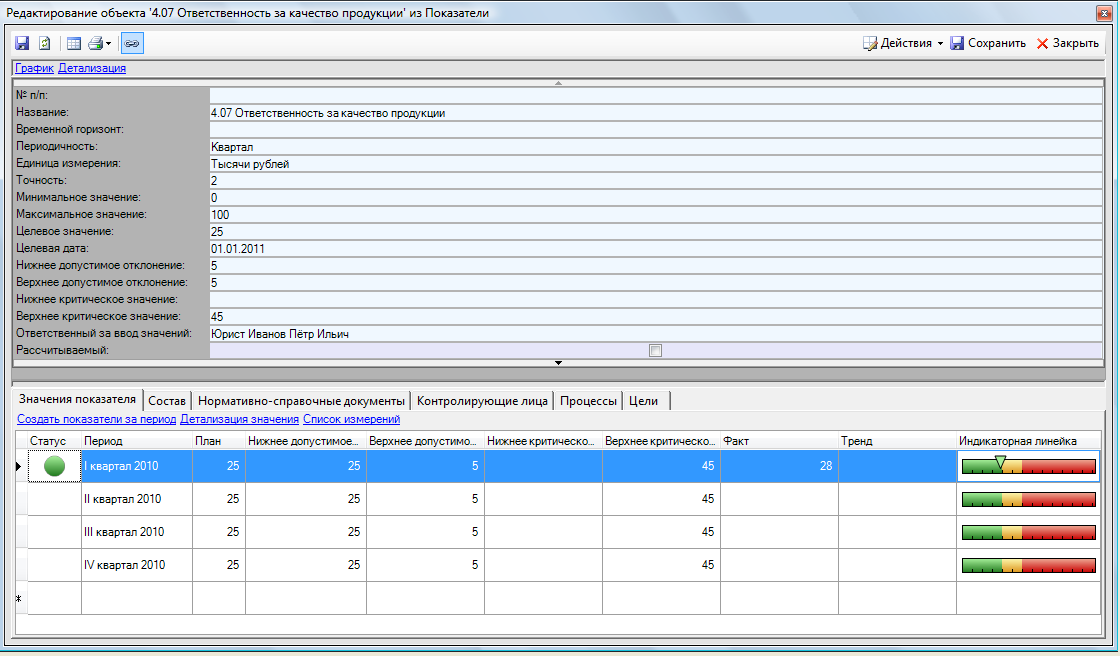 Мы рассмотрим первый вариант: ввод значений в окне Cockpit. При таком подходе за каждой статьёй затрат должно быть закреплено должностное лицо, ответственное за ввод фактических значений данной статьи. Так за статьёй «4.07 Ответственность за качество продукции», которая представляет собой издержки вследствие иска об ответственности за качество и надбавки, выплаченные за обеспечение минимального ущерба от судебного процесса в связи с ответственностью за качество, мы закрепляем Юриста компании. Закрепление должностного лица за статьёй осуществляется в свойствах элемента затрат в поле «Ответственный за ввод значений» (Рисунок 6).