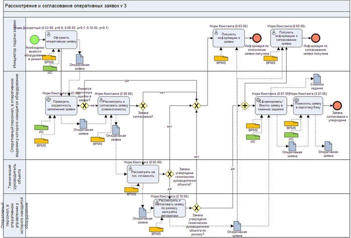 На схеме процесса показано время выполнения каждой операции. Например, для операции «Рассмотреть и согласовать заявку (совместимость)» сверху указано «Норм. Константа (0:05:00)». Это означает, что нормативное время выполнения данной операции составляет 5 минут. Там, где снизу операции написано «Ож. Константа…», это означает время ожидания выполнения