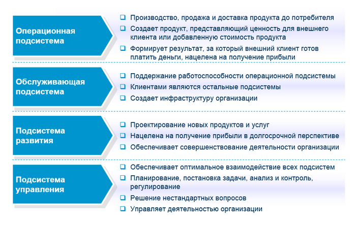 Время конкуренции на уровне продуктов, услуг и технологий уходит на второй план, в прошлое. То, что мы делали вчера, сегодня может быть никому не интересным. При этом есть нечто, что определяет жизнеспособность и успех организации. Это бизнес-архитектура. Организация создает набор правил и моделей, которые формируют гибкую и адаптивную внутреннюю среду, позволяющую соответствовать вызовам внешней среды: запускать производство новых продуктов, внедрять новые технологии, обучать персонал и масштабировать перспективные бизнес-направления. Своевременное инициирование и поддержка «правильных» изменений требует выделения отдельного класса активностей для менеджеров. Речь идет об организационном развитии — деятельности по улучшению и развитию компании. Для понимания предмета этой деятельности, рассмотрим подробнее основные подсистемы организации.