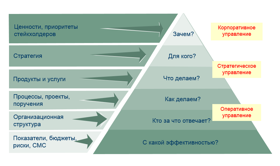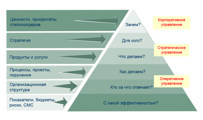 Уровень корпоративного управления определяет стратегию. Она отвечает на вопросы, какие продукты нужно разрабатывать, а от каких пора отказываться.