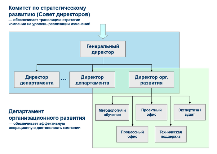 В рамках такого подхода отдел организационного развития отвечает не только за регламентацию текущих бизнес-процессов, но и за развитие организации в целом. Здесь мы говорим об «организационном развитии 2.0».