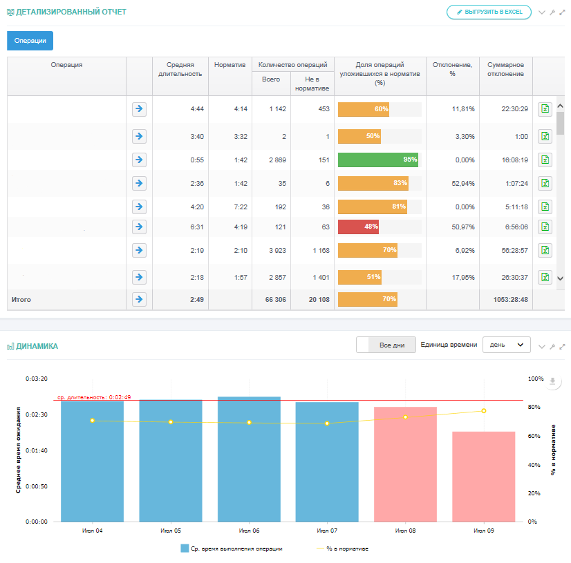 Фактические данные по каждой операции в рамках процесса сравниваются с нормативами, результаты визуализируются и выводятся в виде отчета на аналитические витрины.
