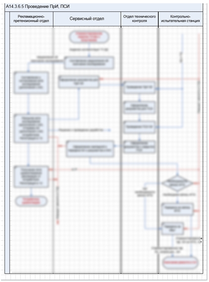 На первом этапе было проведено обучение системе Business Studio 45 сотрудников в разных отделах. Это помогло не только визуализировать процессы и убрать «бутылочное горлышко» с отдела качества, как «отрисовщика процессов», но и получить «агентов влияния» в распространении процессного подхода. Описание процессов дало возможность увидеть иерархичность процессов — процессов верхнего уровня (для них сразу нашлось применение нотации IDEF0) и процессов более низкого уровня, для которых используется нотация «процедура». Такой подход позволил наглядно показать, как работает матричная структура управления, когда для выполнения той или иной функции необязательно, чтобы сотрудники находились в подчинении у одного руководителя. Это продемонстрировано на Рис. 3, где представлена процедура проведения испытаний отремонтированного изделия, в которых участвуют различные отделы, подчинённые разным функциональным подразделениям, а вся процедура является частью процесса ремонта, Рис. 4.