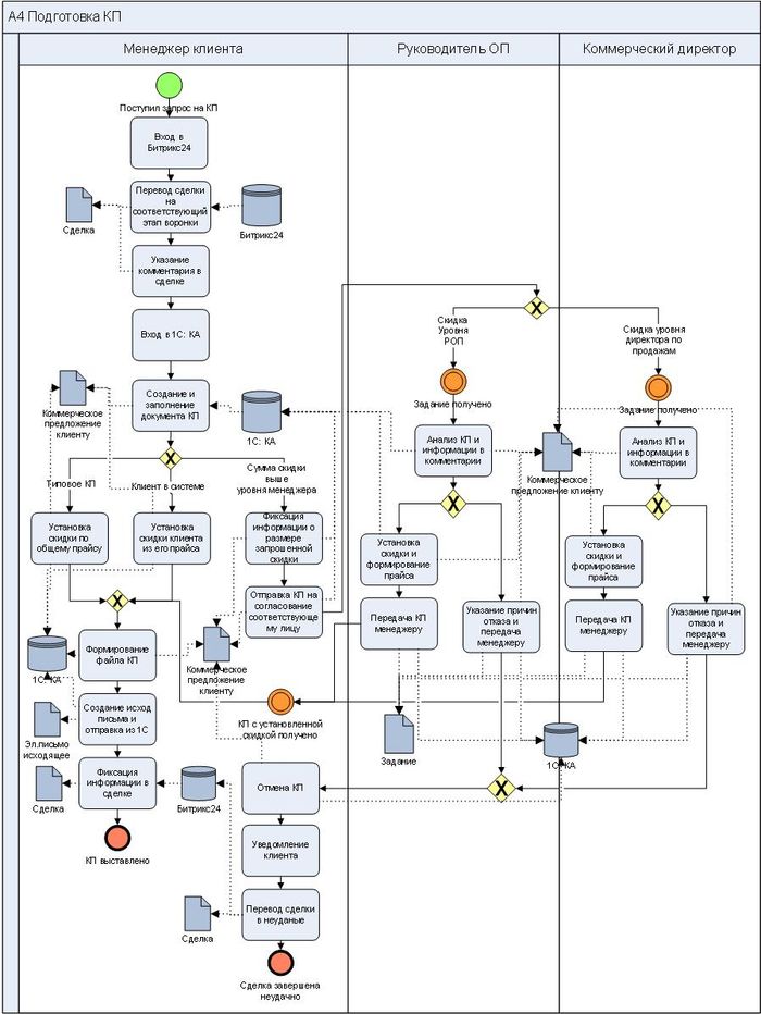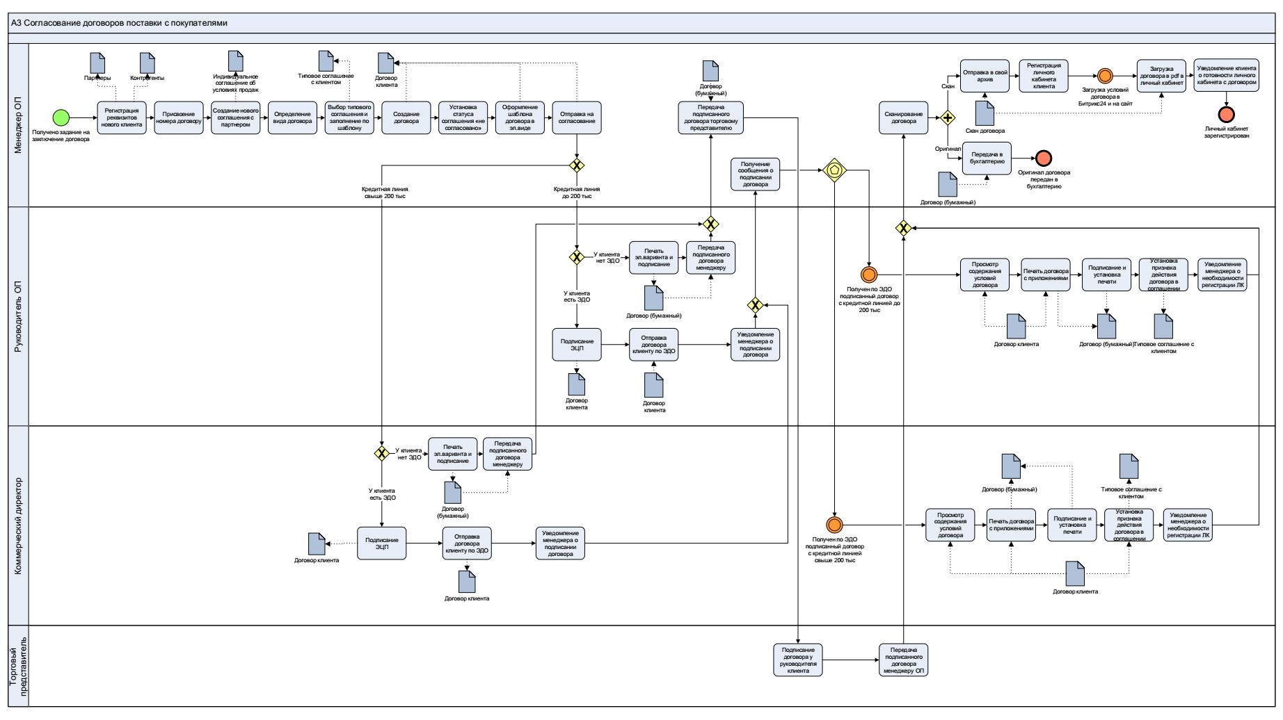 Бизнес-процесс оформления договорных отношений с заказчиком описывает и регламентирует все возможные варианты развития событий от обращения потенциального клиента в компанию «Кормовит» до момента, когда ему дают доступ в личный кабинет. Этот сценарий был формализован в графическом виде — последовательная цепочка выполнения определенных действий и наступления событий, при которых бизнес-процесс заключения договора завершается успешно, либо предусмотрены ситуации, когда необходима корректировка процесса по оформлению договорных условий.