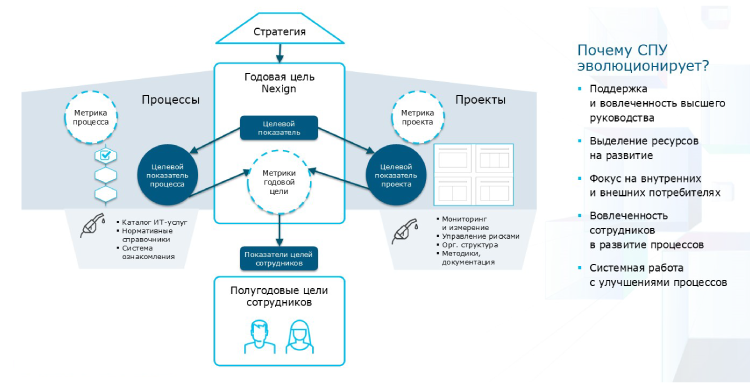 Связь стратегии и развития. Поскольку в работу вовлечены и руководители, и исполнители, все вводимые процессы связаны со стратегией, что помогает всему коллективу двигаться в одном направлении.