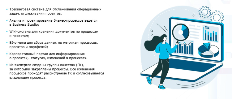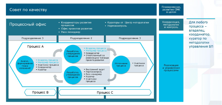 Мы создали процессный офис – структуру, в которую входят координаторы развития бизнес-процессов, риск-менеджеры, менеджеры проектов по развитию, иными словами, те, кто непосредственно участвует в оптимизации процессов наряду с владельцами, формирует и развивает методологию.