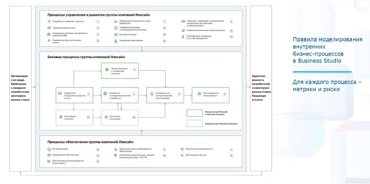 Процессная структура компании представляет собой классическую модель, отражающую цепочку создания ценности, процессы управления и обеспечения. Все результаты измеримы, поскольку для каждого процесса описаны соответствующие цели, метрики и риски.
