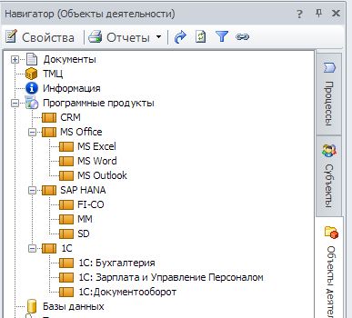 В Business Studio 5 можно создать структуру используемых в компании программных продуктов в справочнике «Объекты деятельности/Программные продукты». На рис. 1 показан пример структуры программных продуктов компании.