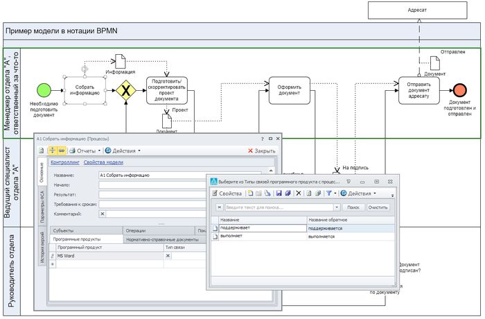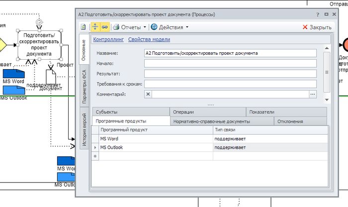 Обратите внимание, что тип связи программного обеспечения с операцией процесса — «выполняет». Таким образом, можно визуально показывать программное обеспечение в качестве полноценного участника процесса.