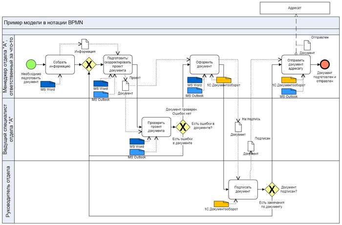 Для чего нужна информация о программных продуктах на схемах типа Work Flow (eEPC, BPMN)? Конечно, в модели такого типа нас интересует, прежде всего, корректный (без логических ошибок) алгоритм выполнения процесса. Движение документов на схеме, взаимодействие по входам-выходам с другими процессами, описание используемого программного обеспечения, рисков и прочих объектов делают из графической схемы модель бизнес-процесса. Это дает нам возможность выполнять анализ процесса «как есть», находить проблемы и выявлять их причины, определять потенциал повышения эффективности процесса за счет реализации ряда мероприятий.