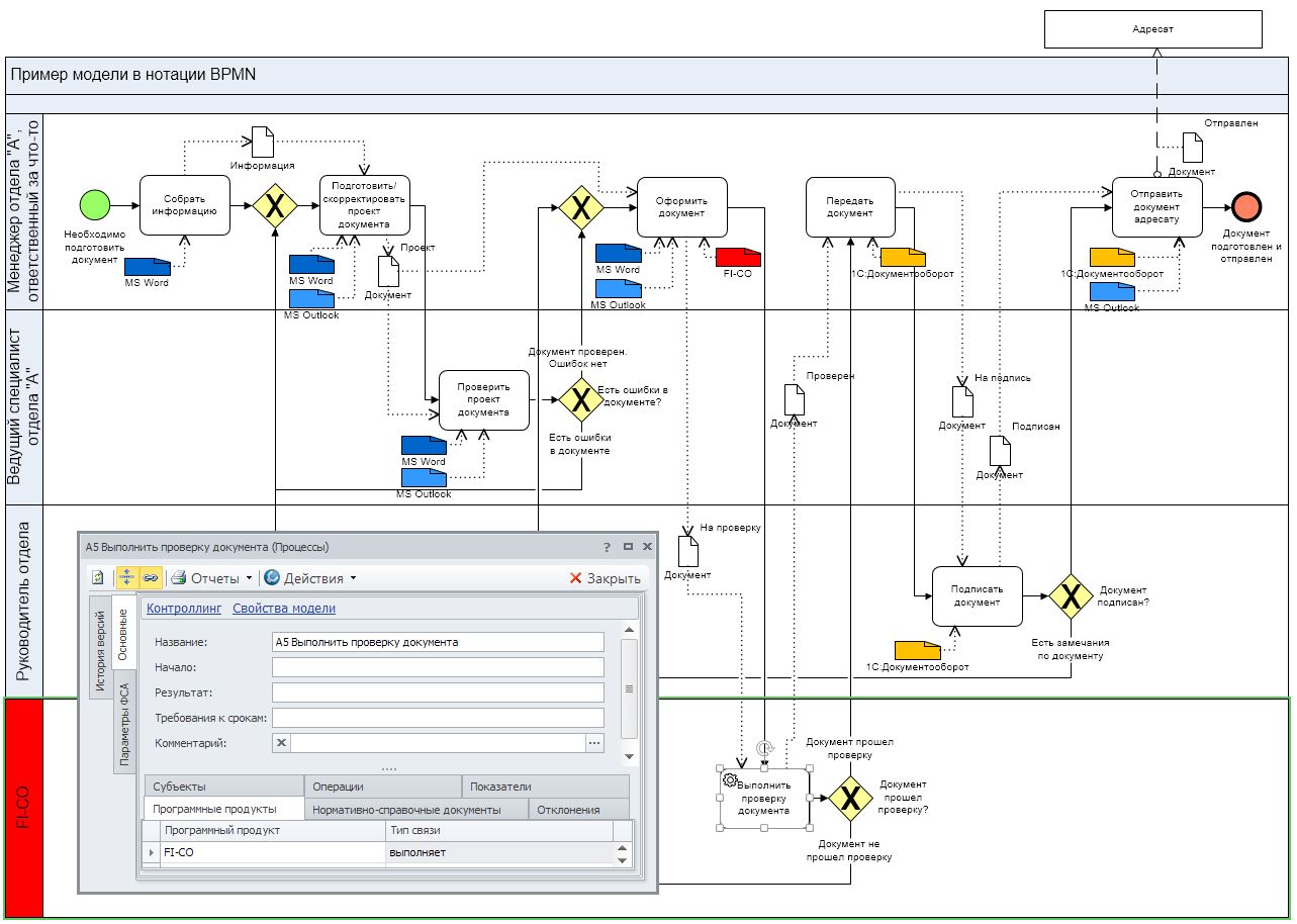 В Business Studio 5 появилась возможность использовать программное обеспечение в качестве дорожки на схеме в нотации BPNN. На рис. 7 показана измененная схема процесса, на которой модуль «FI-CO» показан в виде дорожки. Дополнительно для наглядности использован маркер автоматического выполнения операции.