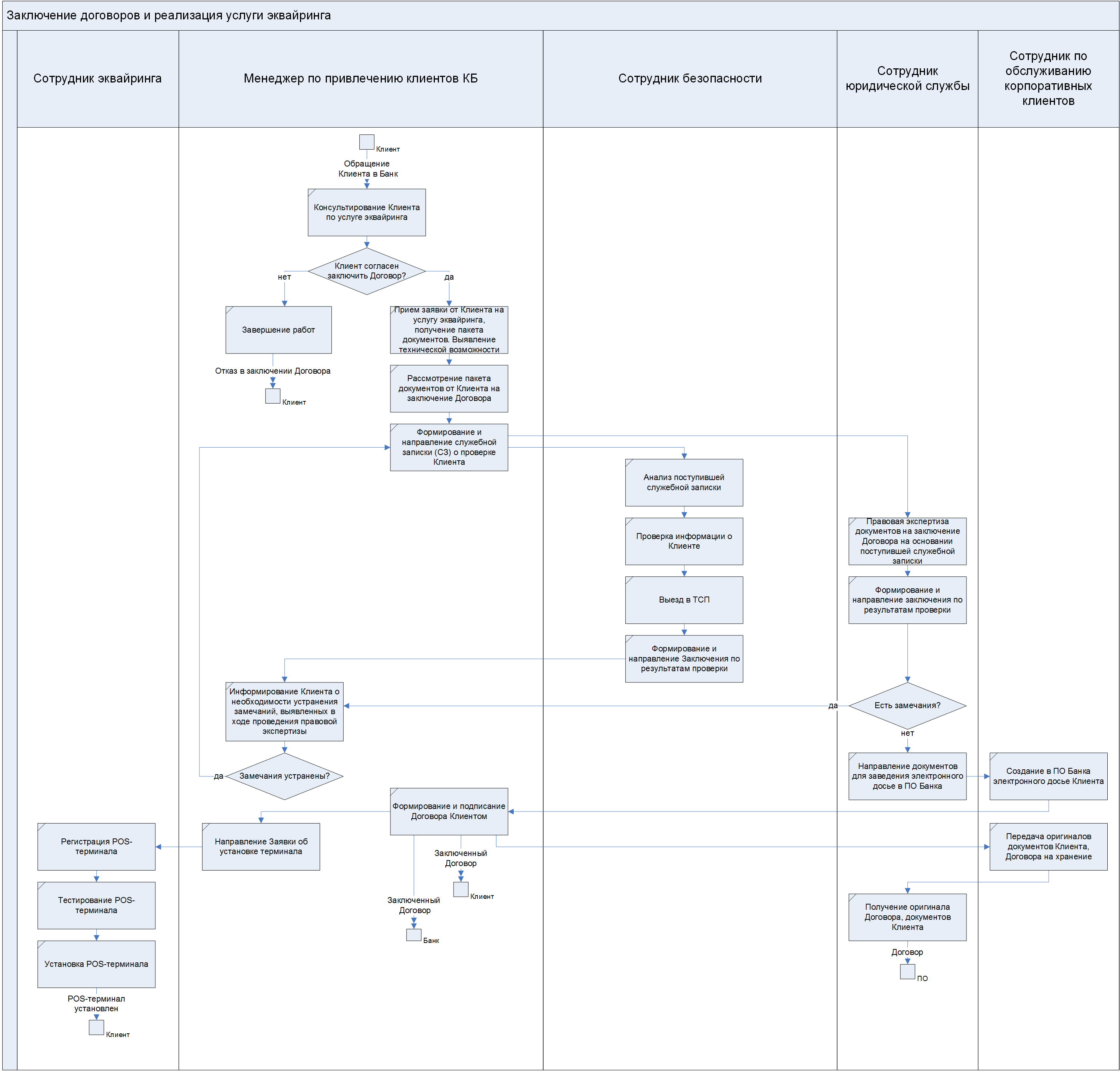 Так, при поступлении в банк документов для заключения договора торгового эквайринга не осуществлялась их первичная проверка, и замечания сообщали в течение двух рабочих дней; сотрудники юридической службы и службы безопасности проверяли документацию последовательно; выезд в