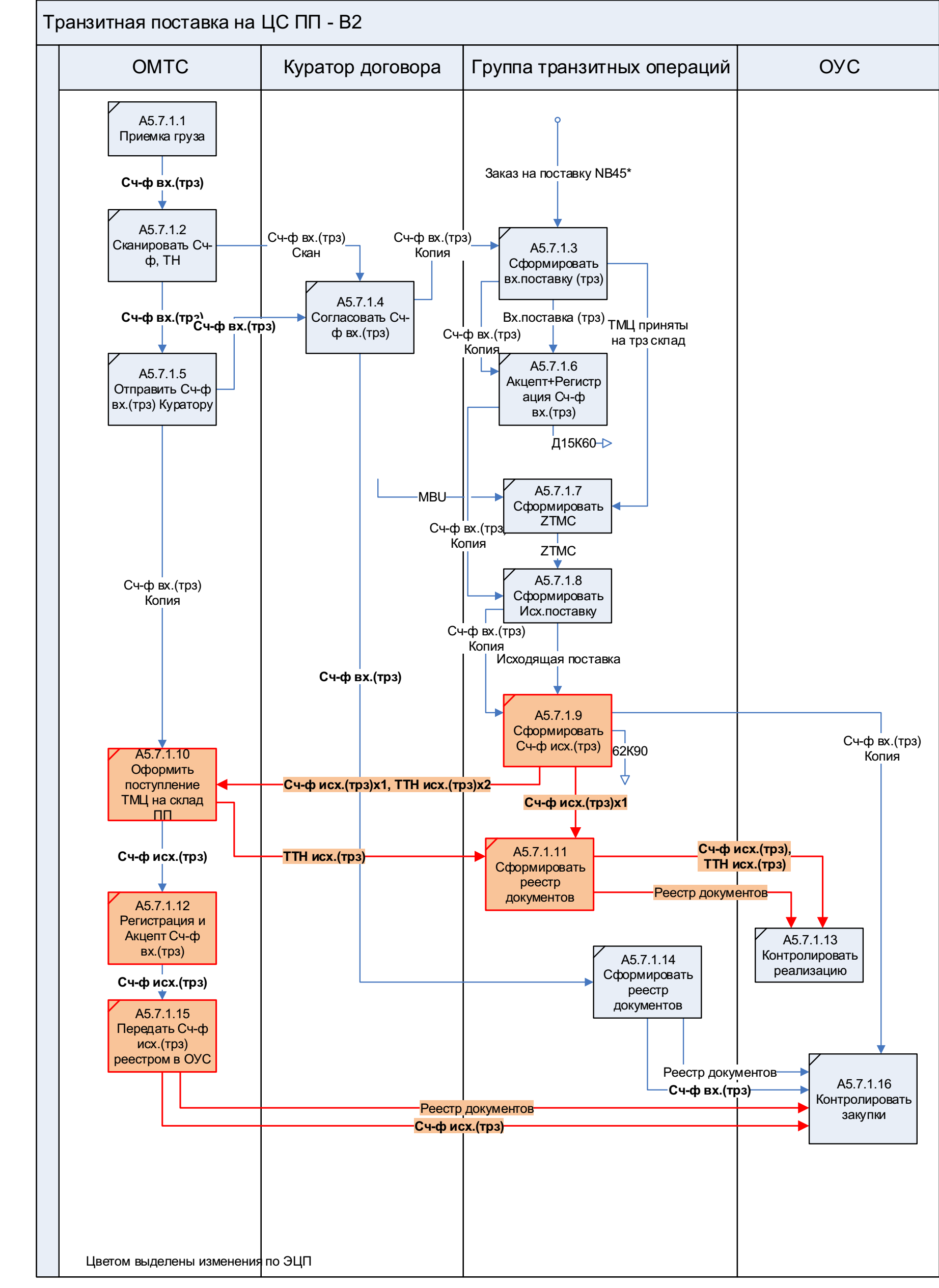 И тут вновь созданные модели процессов позволили команде учесть влияние требований смежного проекта. На схеме ниже красным отмечены те процессы в исходной модели, которых должны были коснуться изменения, связанные с появлением ЭЦП. Таким образом, мы на ходу могли учесть любое количество изменений, инициированных смежными проектами.