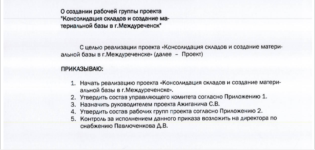 Рис. 2. Фрагмент приказа о создании РГ проекта