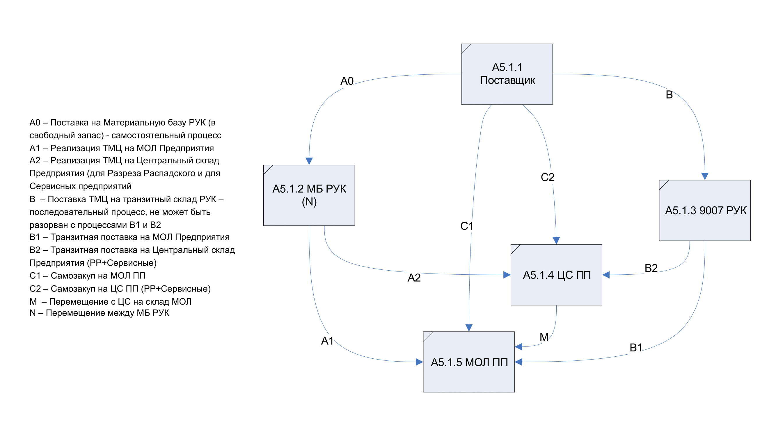 Каждый вариант поставки был проиндексирован. Например, если Поставщик поставляет материалы на материальную базу — смотри схему А0. Так мы поняли, сколько схем нам предстояло описать — 8 схем поставки и 2 схемы по перемещению. Сплошное описание процессов вовсе и не требовалось.