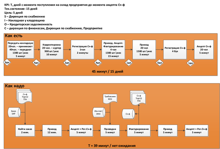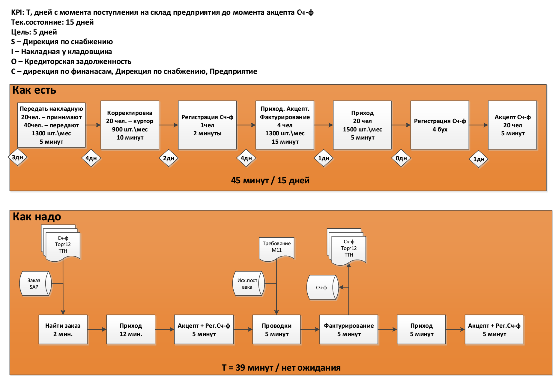 До начала проекта оптимизации системы снабжения выдача ТМЦ сопровождалась перемещением ТМЦ в подотчет получателю. Но в целевой модели процесс перемещения превратился в процесс купли-продажи, поскольку Заявитель ТМЦ теперь получал ТМЦ не со склада своего предприятия, а со склада «чужого» ЮЛ (управляющей компании). По своей сути это напоминает приобретение ТМЦ в магазине, но только не в розницу, а между двумя ЮЛ с последующим выставлением Счета-фактуры и оплатой по нему. Операция купли-продажи более трудоемкая по сравнению с операцией перемещения ТМЦ. Замеры показали, что в среднем общее время на перевыставление транзитного счета-фактуры уходит 15 дней (от 5 до 30 дней). Сама операция занимает в среднем 45 минут. Именно по этой причине процедура выдачи ТМЦ в производство становится объектом № 1 для оптимизации.