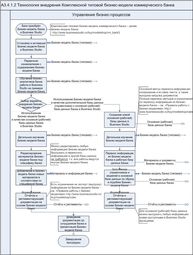 Далее технология внедрения разделяется на 2 альтернативных варианта. Подробную информацию об особенностях, плюсах и минусах каждого варианта — см. «Таблица 1. Варианты внедрения и использования Типовой бизнес-модели банка».