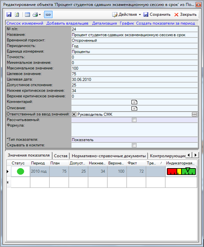 Заполнение параметров рассмотрим на примере показателя «Процент студентов, сдавших экзаменационную сессию в срок» процесса «Проведение итогового контроля» (рис. 4). Как уже было сказано, периодичность ввода значения — год, измеряться показатель будет в процентах от 0 до 100. Целевым значением является 75% при допустимом отклонении 25%. Нижнее критическое значение составляет 34%, верхнее в данном случае отсутствует. При заполнении фактического значения мы видим индикаторную линейку, иллюстрирующую положение введенного значения относительно заданных параметров. Из рис. 4 видно, что показатель находится в пределах допустимого диапазона (зелёный цвет маркера).