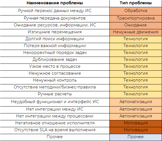 На рис. 3 показаны возможные типы проблем, которые можно выявить. Определено несколько типов: «Обработка», «Транспортировка», «Ожидание», «Ненужные движения» - это потери (метод Lean). Далее могут быть проблемы, связанные с технологией выполнения процесса и его автоматизацией, мотивацией исполнителей. Возможно, вы дополните перечень своими типами проблем, специфичными именно для вашей организации.