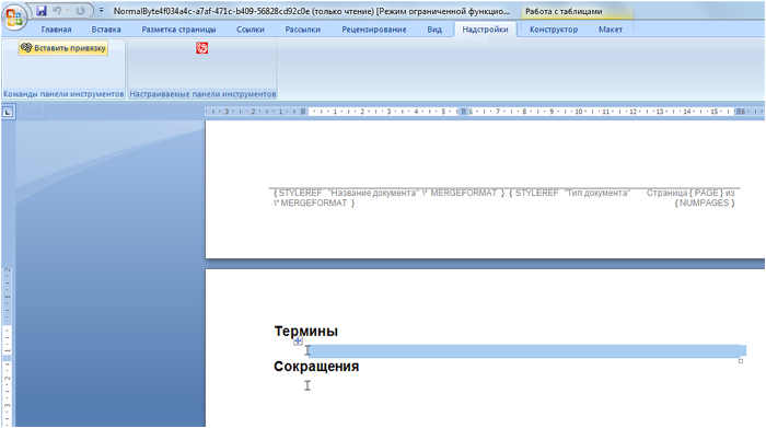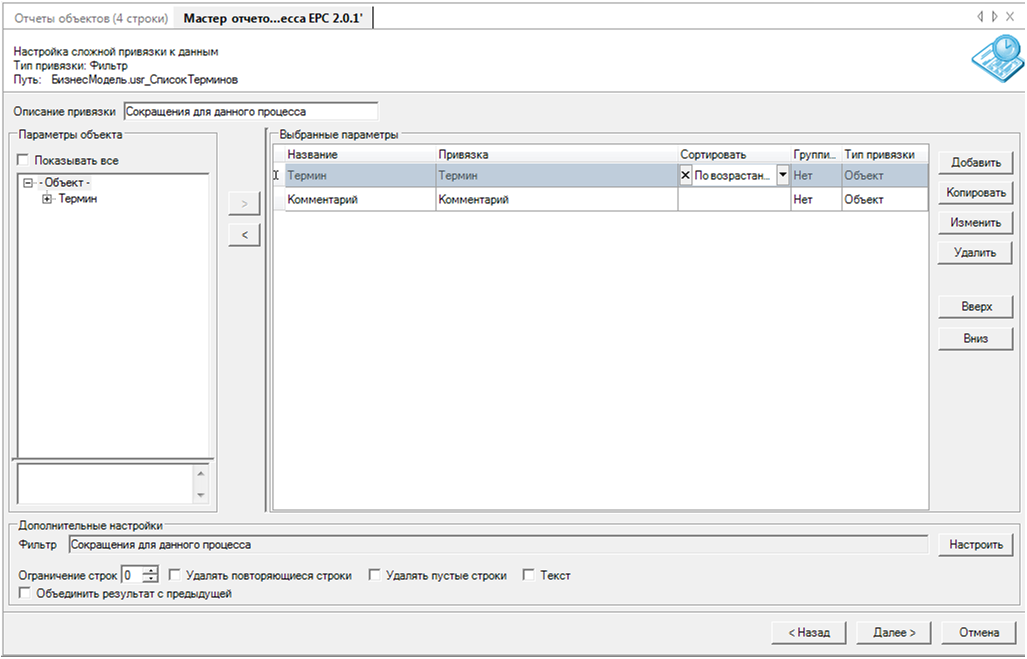Самое время приступить к работе с шаблоном отчета: нам требуется организовать в регламенте процесса место для вывода интересующей нас информации. Вместо раздела «Термины и определения» я создал два раздела «Термины» и «Сокращения», в каждый из которых добавил привязку типа фильтр, соответствующую разделу.