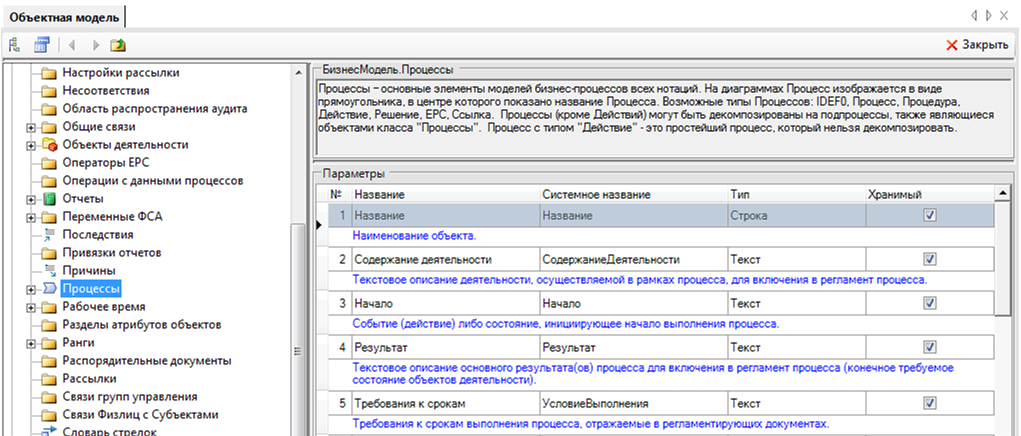 Но вернемся в Meta Edit. Итак, мы выбрали нужный нам модуль. И теперь можем поработать с параметрами класса «Процессы» (Рисунок 9). Мы добавим в свойства процесса сложный параметр типа «Список», в который, собственно, и будем добавлять термины, связанные с конкретным процессом.