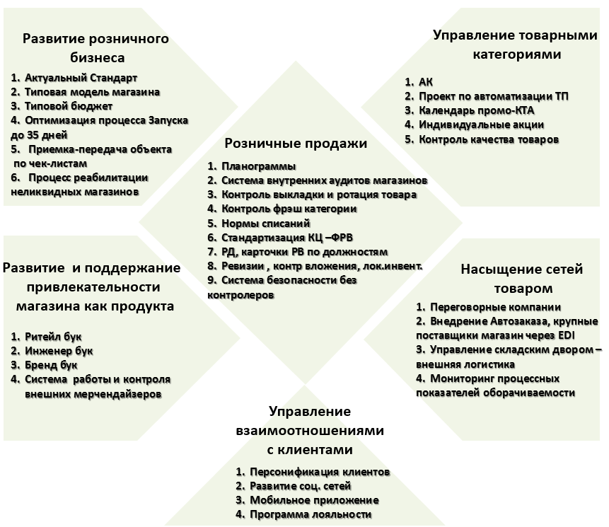 В работе по развитию привлекательности каждого магазина мы прошли путь от абсолютной неуправляемости стандартами сервиса, когда в каждом магазине выкладка товаров, обеспечение чистоты и эстетики торгового пространства были вопросами исключительно уровня его директора, до жестких и понятных требований, единых для каждого из форматов. Эти требования, а также требования к техническому обеспечению каждого магазина мы объединили в документах, называемых Ритейл бук, Инженер бук и Бренд бук. Выкладка товара осуществляется по планограммам, разработанным для всех категорий. Сейчас любой поставщик, который хочет помочь нам с выкладкой своих товаров должен соблюдать и довести до своих сотрудников оформленные нами в виде стандарта требования к их внешнему виду, порядку их допуска в магазин и порядку работы с выкладкой товаров.