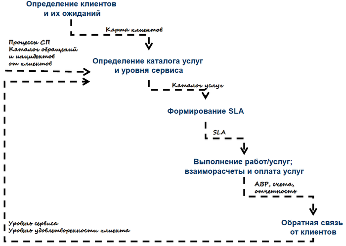 Взаимоотношения между органами управления и исполнителями основных процессов компании с другими подразделениями должны строиться как отношения заказчика (клиента) и исполнителя сервисных работ и никак иначе. Мы реализуем этот принцип, внедрив практику работы с Соглашением об уровне сервиса (SLA — Service Level Agreement) — внутрикорпоративный контракт, заключаемый между руководителем — поставщиком услуг и руководителем — получателем (клиентом) сервиса.