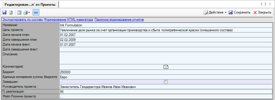 В результате заполнения свойств проекта (Рисунок 17) из Business Studio можно сформировать отчет «Резюме проекта» (см. Приложение 1). При подготовке отчета использовался Мастер отчетов, который поставляется вместе с программой. Настроенный отчет в формате