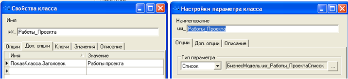 Для закладки «Работы проекта» параметры списка и параметр класса «Проекты»: