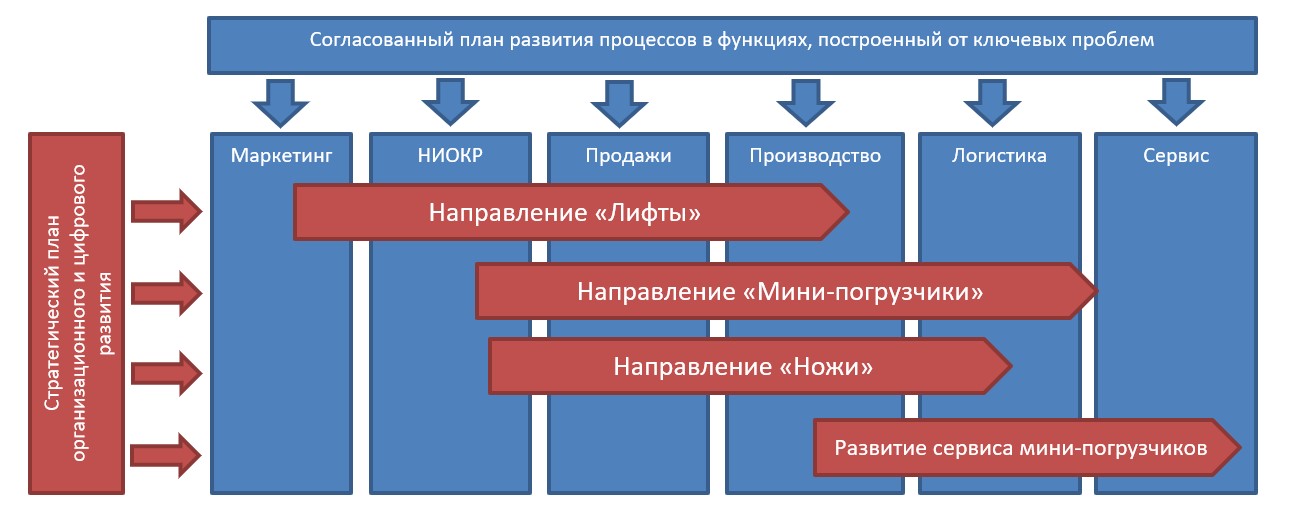 В нашем случае подразделение организационного развития осуществляет координацию и методологическую поддержку изменений в группе компаний, формирует готовую программу проектов, включающую решение ключевых кросс-функциональных проблем и проекты повышения эффективности. Такие проекты должны захватывать целиком цепочку создания ценности по одному из направлений деятельности и использовать весь потенциал процессной оптимизации, бережливого производства и цифровизации.