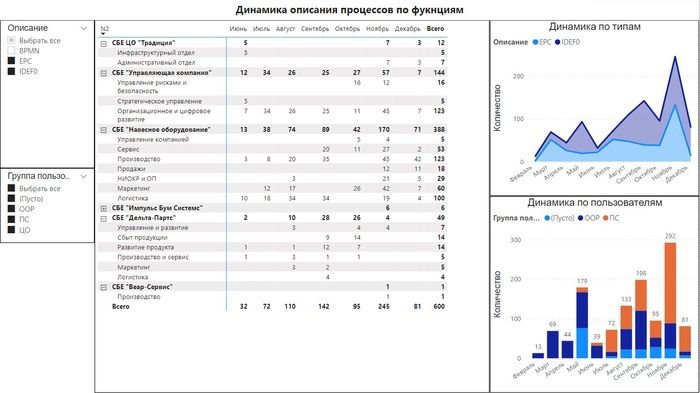 - Реквизиты «Важность» и «Уровень» процесса и отчет по количеству описанных моделей по уровням иерархии.