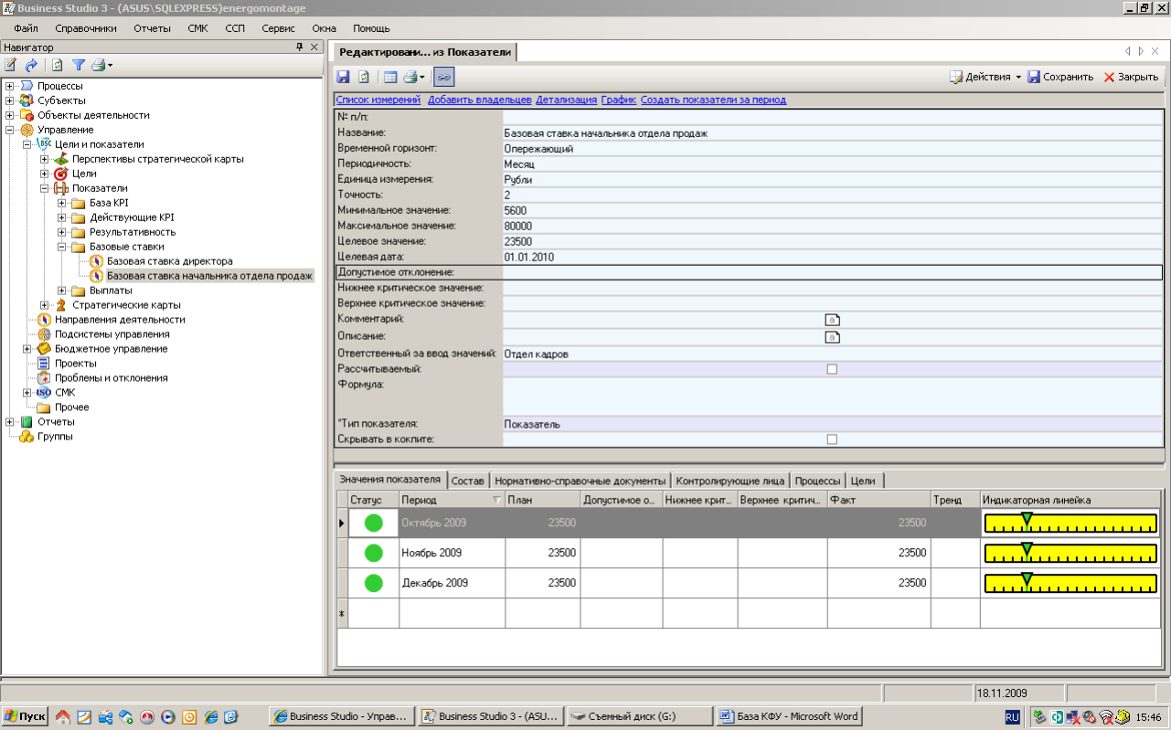 Из свойств показателя мы можем заключить, что объем продаж к январю 2010 года (целевая дата) ежемесячно должен составлять 1 250 тыс. рублей (целевое значение). Движение к этому целевому значению мы будем отслеживать ежемесячно (периодичность) путем контроля за достижением планового значения (план) показателя для каждого месяца.