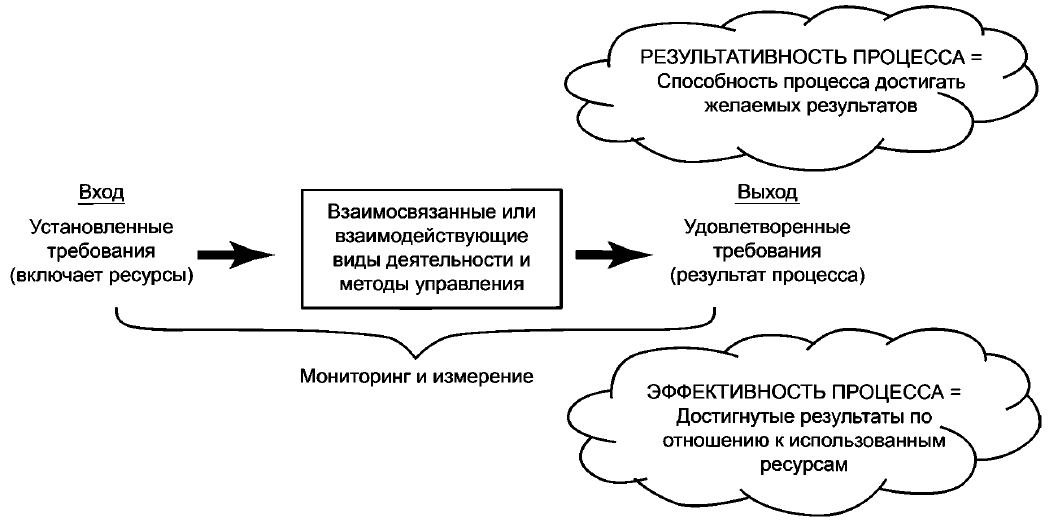 В соответствии с рекомендациями по менеджменту качества [4] для оценки степени достижения цели процесса (установленных характеристик процесса и его результатов) рекомендуется использовать показатели результативности и эффективности (рис.3), имеющие следующие определения [5]: