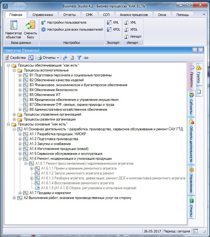 Построение непосредственно модели бизнес-процессов АО «ОДК-СТАР» началось с создания реестра процессов верхнего уровня, состоящего из двух направлений деятельности, 7 основных бизнес-процессов (в соответствии с полным жизненным циклом продукта, начиная от его разработки, заканчивая обслуживанием в эксплуатации и утилизацией) и 12 обеспечивающих (сюда входят: вспомогательные процессы, процессы управления и процессы развития организации). Дальнейшая работа пошла по пути декомпозиции процессов верхнего уровня (диаграммы процессов при этом не создавались или создавались в очень ограниченном объёме). При этом были задействованы ранние наработки предприятия в этой сфере и эталонная (референтная) модель производственного предприятия, которая опубликована в свободном доступе на сайте разработчика businessstudio.ru. Надо сказать, что эта задача была очень нетривиальной, при согласовании иерархии бизнес-процессов было выявлено множество нестыковок в ранее описанных процессах и «сломано немало копий». Несмотря на то, что изначально особое внимание уделялось детализации основных бизнес-процессов, относящихся к таким видам деятельности как «Закупки и снабжение», «Изготовление новой продукции», «Продажи и маркетинг» (что связано с областью внедрения ERP-системы), в иерархии отмечен максимально полный список процессов. Общее количество обозначенных процессов составило около 800. Из них на сегодняшний день закончены работы по описанию порядка 150 процессов и подпроцессов. Максимально полная декомпозиция, выполненная на первом этапе построения модели, позволила разработчикам лучше осознать суть и принципы деления деятельности на процессы, определить набор и последовательность шагов, составляющих БП верхнего уровня, произвести разделение зон ответственности.
