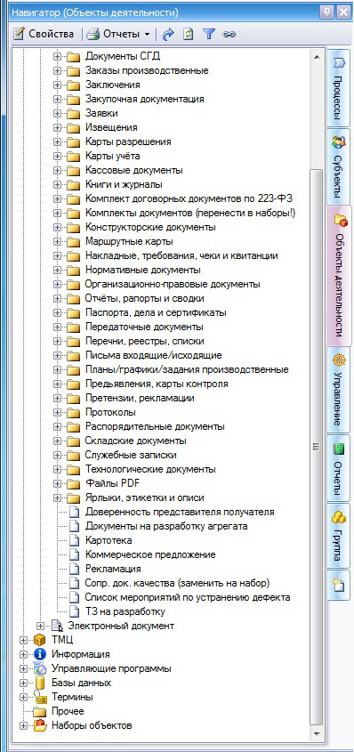 Следующим важным компонентом на пути построения полной Бизнес-модели стало формирование справочников ресурсов (т. н. «Объекты деятельности»), потребляемых бизнес-процессами. Справочники ресурсов изначально подразделены на справочники документов (бумажных и электронных), информационных систем, ТМЦ, баз данных, наборов объектов и т.д. Эти справочники, в отличие от реестра процессов и оргструктур, пополнялись по мере проектирования диаграмм бизнес-процессов. Для справочника документов интересной особенностью стало то, что в объекты типа «Документы» в одно из свойств записываются гиперссылки на формы и примеры заполнения документов, размещённые на информационном портале предприятия. Таким образом достигались сразу 2 цели — построение модели документов в Бизнес-модели предприятия и создание электронного общедоступного архива форм документов. Нестандартным нововведением стала настройка Business Studio для отображения статусов объектов на BPMS-диаграммах. Использование объектов на схеме позволяет увидеть привязку ИС к функциям процесса, движение документов и ТМЦ в ходе деятельности предприятия. Это необходимо в первую очередь для того, чтобы разобраться, откуда и куда идут документы или информационные потоки, и определить, оптимально ли их движение и действительно ли все они необходимы. Также это позволяет использовать модели бизнес-процессов в качестве руководства для новых сотрудников, ведь кроме обозначения документа на схеме и во всех генерируемых отчётах, к нему привязывается ссылка на информационный портал предприятия, по которой открывается форма и пример заполнения документа.