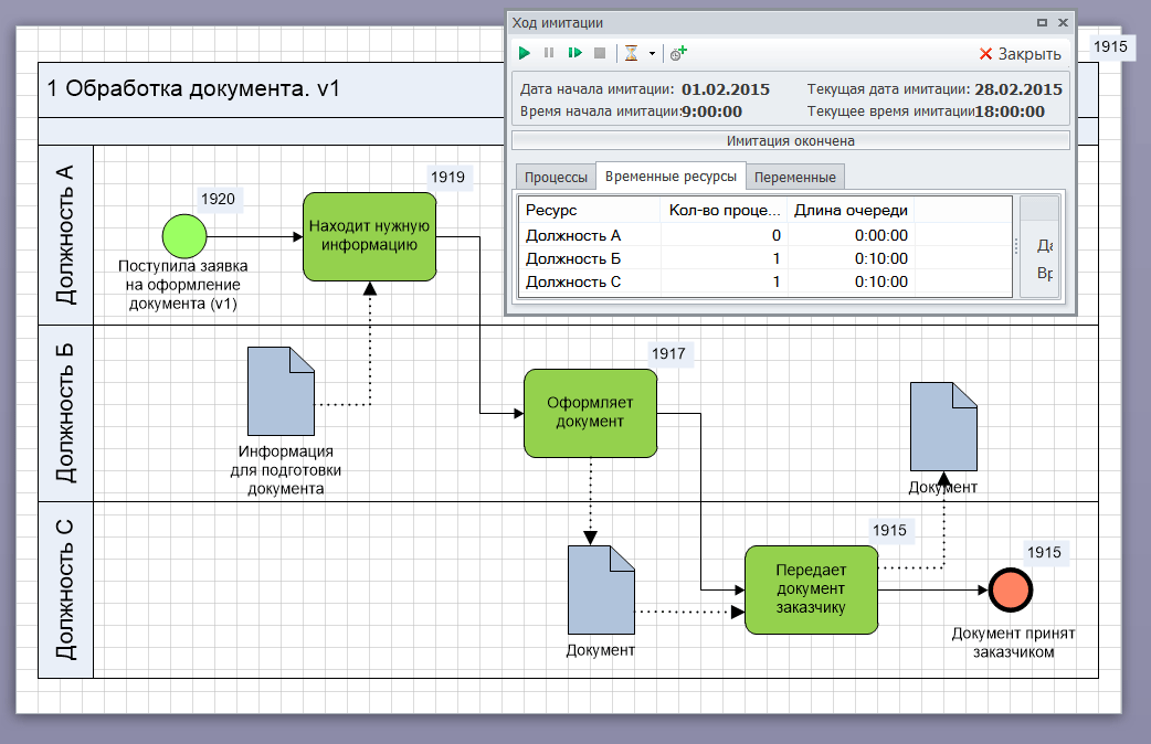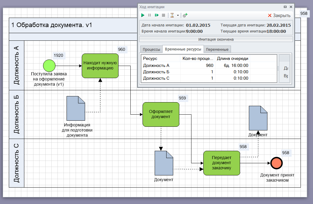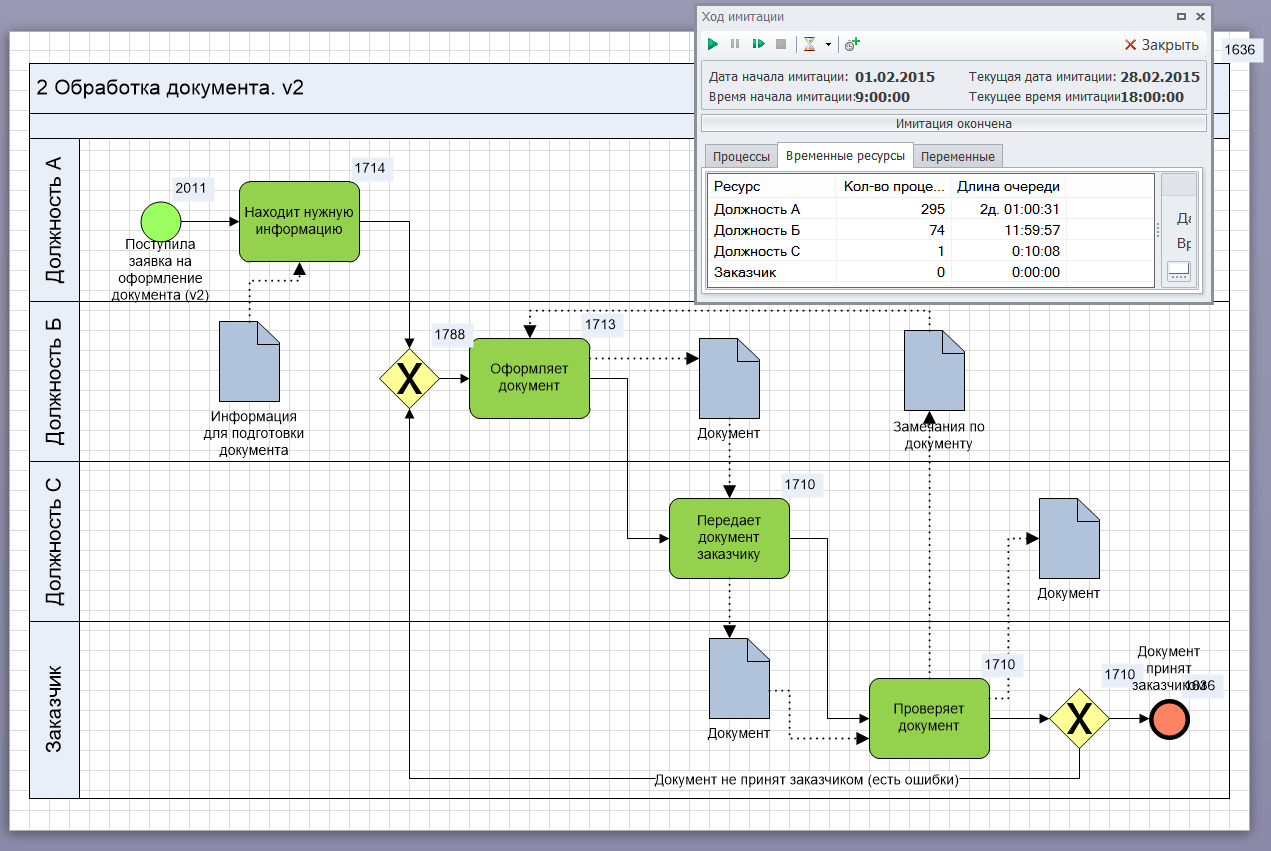 На рис. 2 видно, что практически все заявки были выполнены. Длина очереди почти нулевая. Это означает, что численность по два сотрудника на каждой должности является оптимальной численностью для получения результата данного процесса (документ выдается «в течение 1 рабочего дня с момента подачи заявки» и даже быстрее). При этом мы, конечно, не учитывали прогулы, пьянки и беременность.