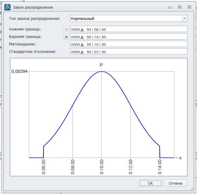 На рис. 5. показано распределение времени выполнения операций процессов. Видно, что матожидание времени выполнения составляет 10 минут.