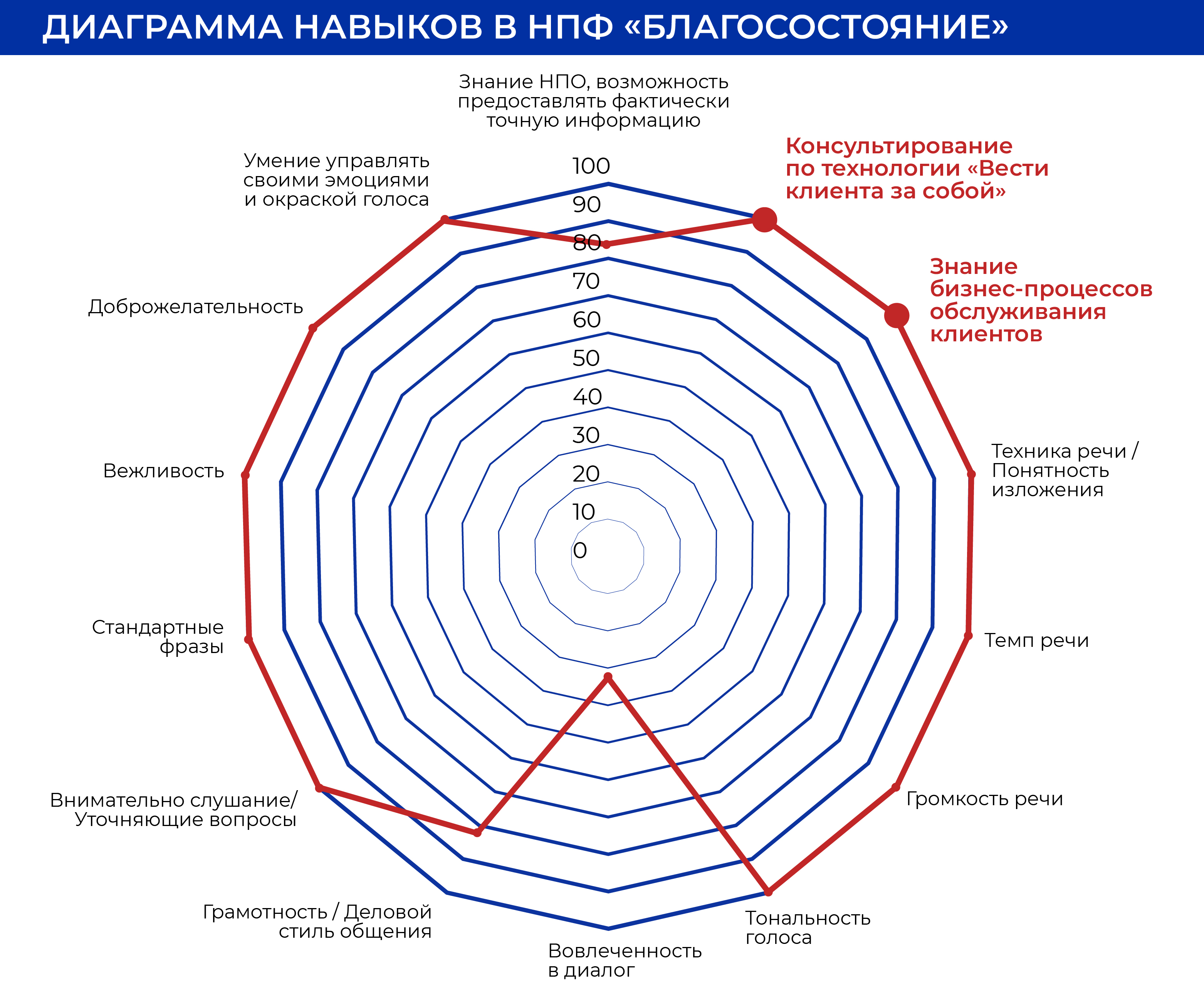 60–70% прямой коммуникации клиентов с фондом приходится на общение по телефону. Далее идет личный прием в офисе, персональные консультации и презентации на предприятиях, письменные обращения. Фонд обслуживает клиентов всех возрастов, и именно это определяет разнообразие используемых каналов коммуникации. Для контроля качества работы телефонных операторов мы используем традиционный для колл-центров механизм калибровок: когда выборочные звонки прослушиваются кураторами и оператор получает обратную связь. Поскольку у нас бесскриптовый колл-центр, мы изначально расширили диаграмму навыков, включив, помимо качества речи, такие показатели, как знание продукта, свободное ориентирование в бизнес-процессах сопровождения и обслуживания клиентов и умение вести клиента за собой (эмоциональное и профессиональное лидерство). Вот так выглядит диаграмма.