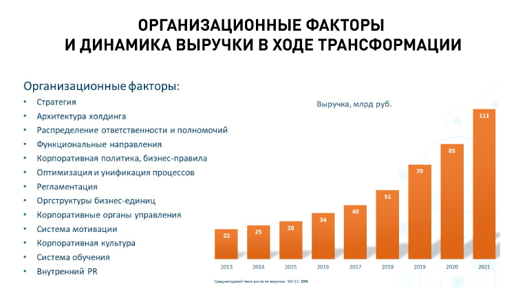 Часто считают, что большие компании не могут непрерывно расти: сначала идет активный рост, а затем следует стабилизация. Но нам предстояло проводить трансформацию одновременно с увеличением масштабов деятельности. То есть мы еще не провели до конца унификацию процессов в компаниях холдинга, не решили вопрос с едиными бизнес-правилами, а масштабы деятельности росли. Так, например, с 2018 до 2021 год объем выручки вырос более чем в два раза. В этих условиях приходилось вести параллельную работу по трансформации холдинга и поддержанию роста.