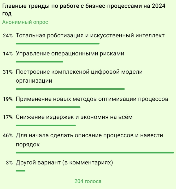 В телеграм-канале «Бизнес-аналитики, системные аналитики, специалисты по рискам и ИТ» [6] автор проводил опрос на тему «Главные тренды по работе с бизнес-процессами» – см. Рис. 1. Проголосовали более 200 человек, и в результате получился следующий рейтинг.