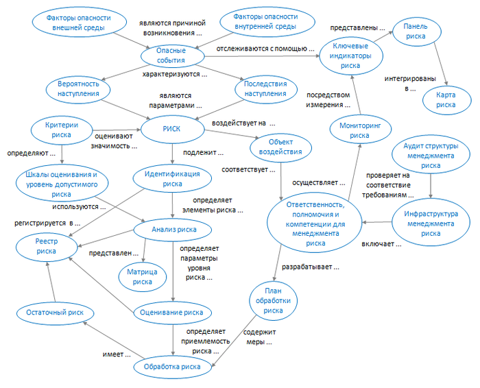 Риск-менеджмент становится частью процесса принятия управленческих решений в условиях неопределенности [2], поэтому для повышения результативности и эффективности таких решений необходимо углублять знания и совершенствовать деловые качества в области управления рисками. Для обобщения сведений о принципах и подходах управления рисками, представленных в большом количестве стандартов, автор предлагает использовать модель в виде семантической сети, которая отражает структуру основных понятий этой предметной области (рис. 1).