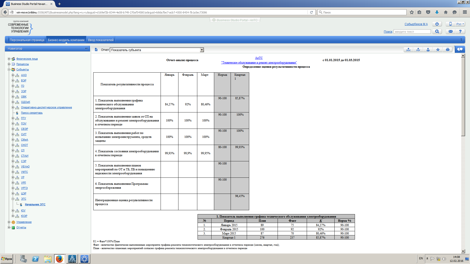 С учетом данных особенностей сотрудниками ТНИЛ «АСУТП» была разработана система автоматизированного расчета оценки ИСМ для предприятия теплоснабжения ТОО «АлТС» на основе системы бизнес-моделирования Business Studio, позволяющей не только работать с показателями, но и поддерживать систему менеджмента качества в целом.