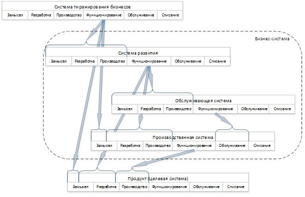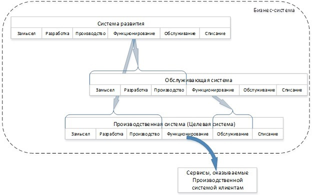 На схеме я отразил тот факт, что Система тиражирования бизнесов частично участвует в замысливании Продукта и Производственной системы. Если замысел оканчивается успешно, то она создает Систему развития, которая продолжает работу по созданию