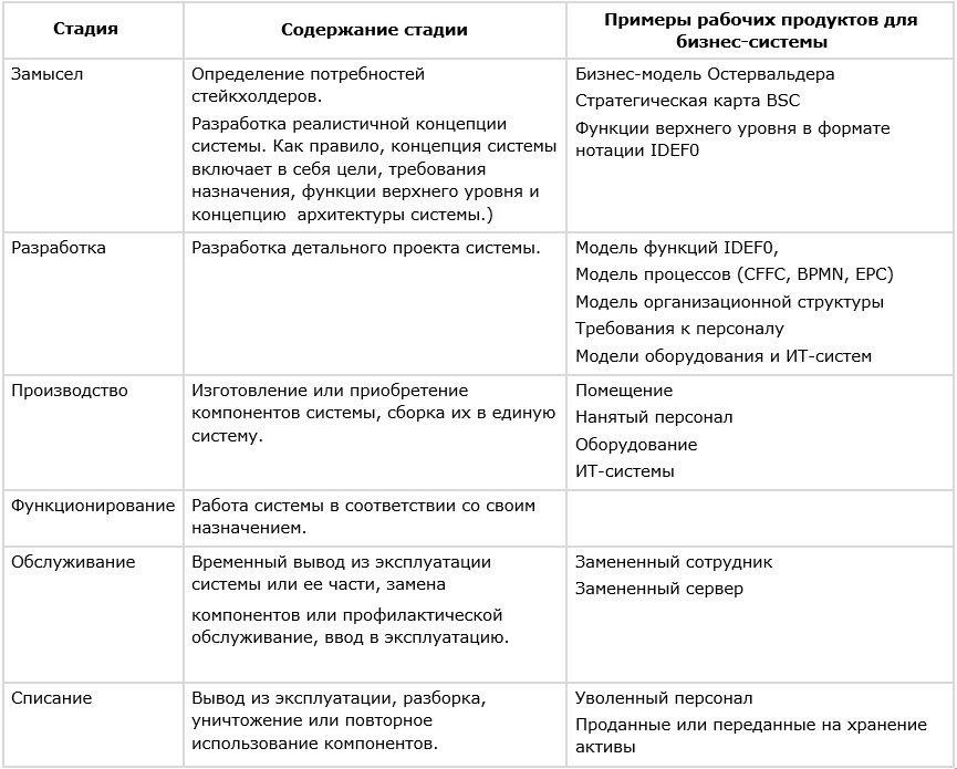 Стадии жизненного цикла отражают следующую идею: «Шаги разработки новой системы можно рассматривать как постепенную „материализацию“ системы — постепенный переход от абстрактной потребности к сборке и монтажу пригодных к работе компонентов, совместно выполняющих сложные функции ради удовлетворения данной потребности» [А.Косяков «Системная инженерия», с.143]. Нужно понимать, что это упрощенное изображение реального протекания стадий, которые в реальности могут накладываться во времени друг на друга, чередоваться (например, функционирование системы и ее обслуживание)
