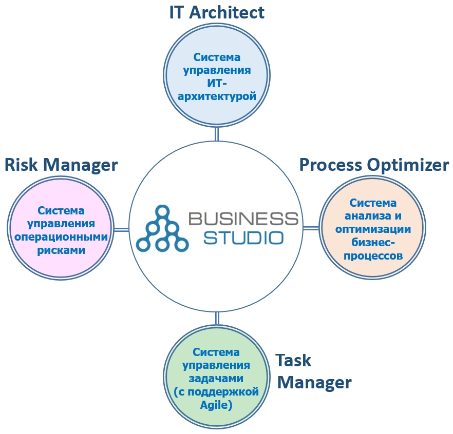 Главное преимущество Toolset состоит в том, что большое количество разнопрофильных задач решаются в рамках одной платформы и базы данных (Business Studio). Такой подход полностью заменяет использование многих узкоспециализированных программных продуктов.