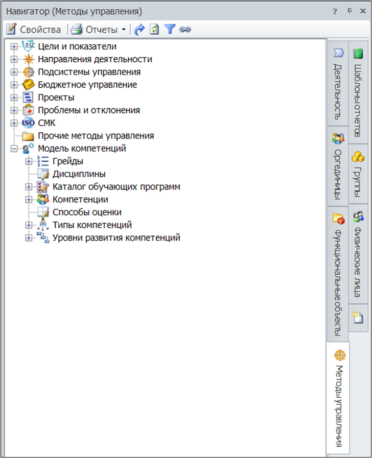 В Навигаторе на вкладке Методы управления находятся справочники, которые служат для формализации методик и технологий управления.