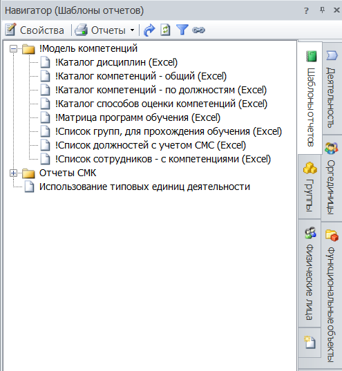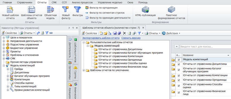 Рис. 2. Шаблоны отчетов объекта – Модель компетенций