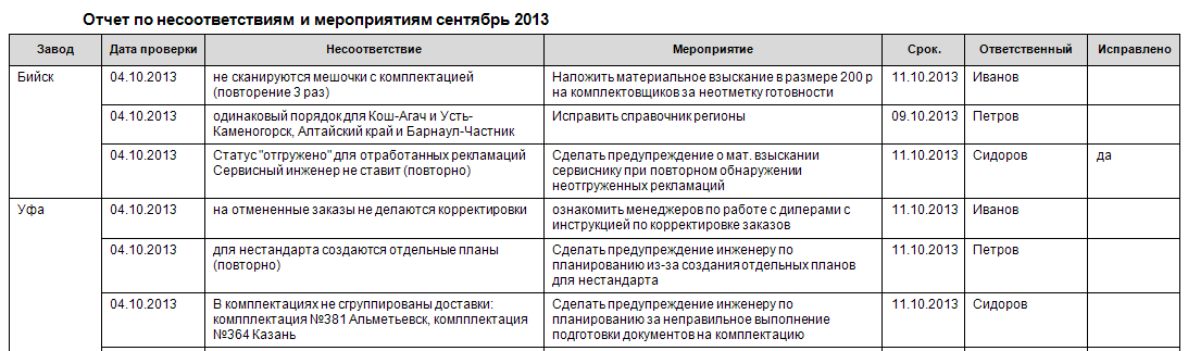 - Отчет по несоответствиям и мероприятиям;