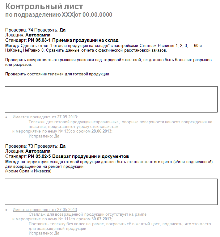 - Контрольный лист (подразделение1 — применяется для компаний, в структура которых состоит из типовых бизнес-единиц. Такие отчеты копируются и переименовываются в соответствии с названиями этих бизнес-единиц).
